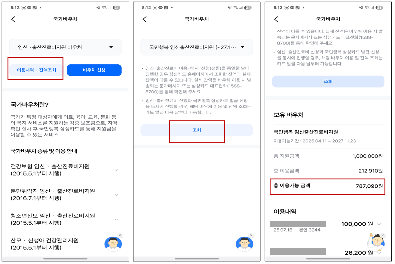 *삼성카드 모바일 앱 접속 ▶ 국가바우처 탭 클릭 ▶ 이용내역 · 잔액 조회 접속 ▶ 조회 클릭 ▶ 잔액 조회