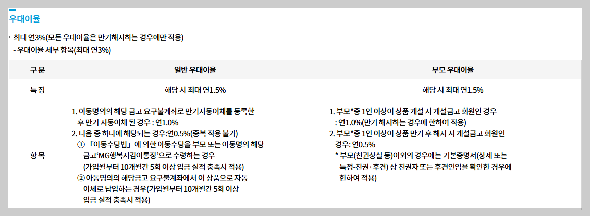 기존에 자녀가 있으신 분들은 국민은행 KB아이사랑적금도 우대이율 꽤 적용받으셔서 유리할 것 같네요.